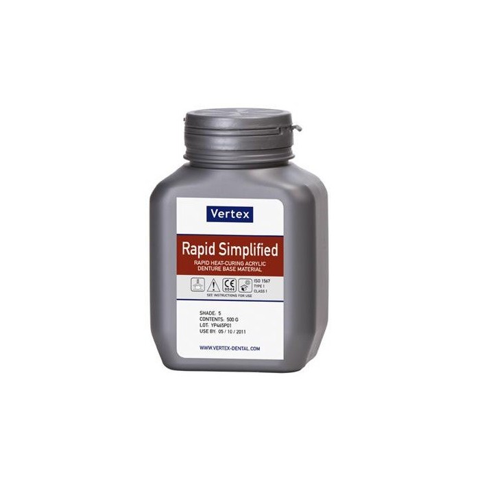 Akryl Vertex Rapid Simplified (RS) jest akrylem polimeryzującym 'na gorąco', przeznaczonym do techniki prasowanej, opartym na metakrylanie metylu (polimer/monomer).