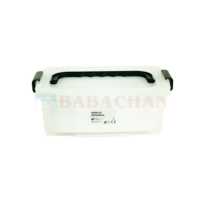 Plastikowa wanienka do dezynfekcji narzędzi stomatologicznych z ociekaczem i przykrywką.