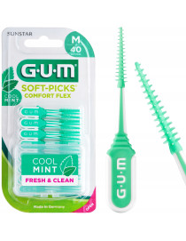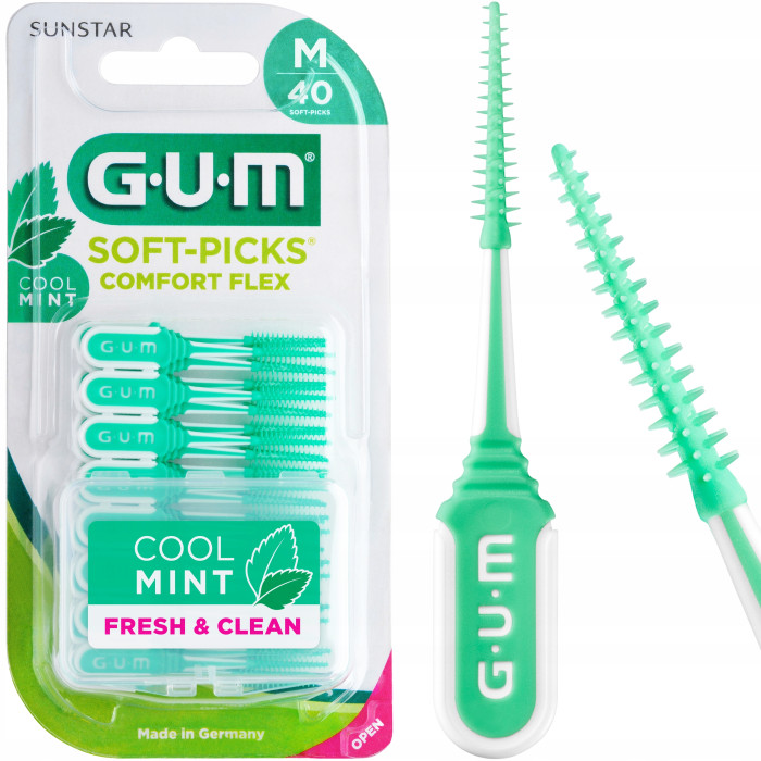 GUM Soft-Picks Comfrot Flex to delikatnie wykałaczki do zębów, które dokładnie usuwają płytkę nazębną i resztki pokarmów z przestrzeni międzyzębowych, wspomagając dodatkowo krążenie krwi w dziąsłach. GUM Soft-Picks Comfort Flex to łatwe i wygodne w użyciu jednorazowe wykałaczki do zębów z super miękkimi, gumowymi włóknami, które są delikatne dla szkliwa i dziąseł.