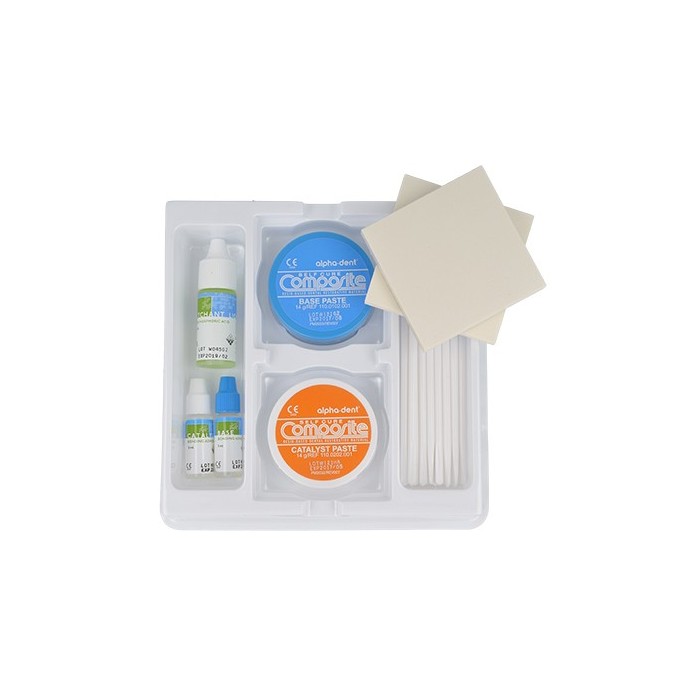 Kompozyt chemoutwardzalny Alpha-dent Chemical Cure Composite zawiera objętościowo 63% nieorganicznego wypełniacza, nieprzenikalnego dla promieni RTG o rozmiarach ziaren od 0.04 do 15 mikronów. Monomer matrycy organicznej bazuje na żywicy Bis-GMA.