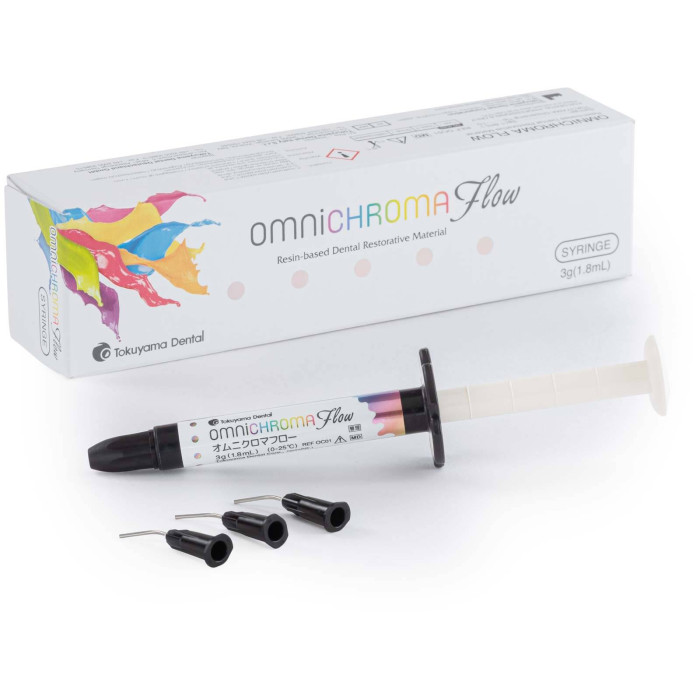 OMNICHROMA FLOW firmy TOKUYAMA DENTAL jest światłoutwardzalnym, nieprzeziernym dla promieni rentgenowskich kompozytem o niskiej lepkości, oferującym szeroką możliwość dopasowania koloru. Jeden materiał Flowable dla wszystkich odcieni - od A1 do D4.