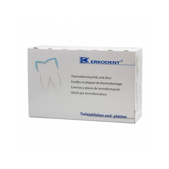 Twarda, przeźroczysta folia termoformowalna (PETG) z folią izolacyjną do produkcji szyn zgryzowych. Spala się bezresztkowo. Wyrób medyczny klasy 2a.
