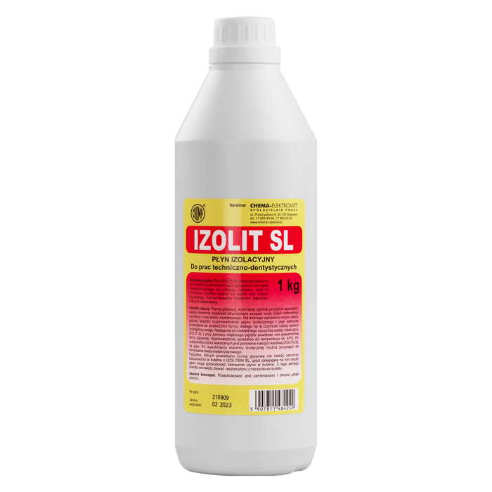 Płyn IZOLIT SL jest przeznaczony do izolowania powierzchni form gipsowych od ciasta metakrylanowego na protezy zębowe.