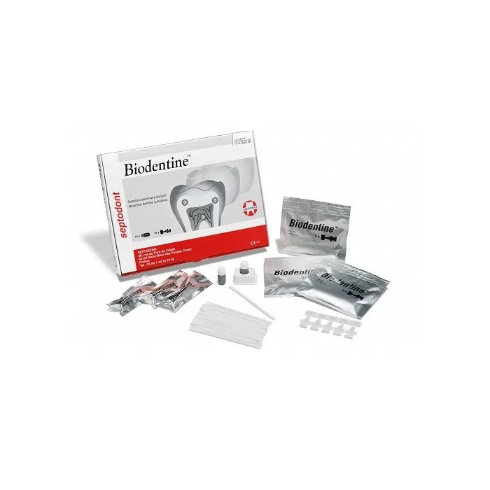 Biodentine to biokompatybilny i bioaktywny materiał do tworzenia zębiny reparacyjnej. Posiada doskonałe właściwości uszczelniające. Może zastąpić zębinę zarówno w obszarze korony, jak i korzenia, przy zachowaniu żywotności miazgi.